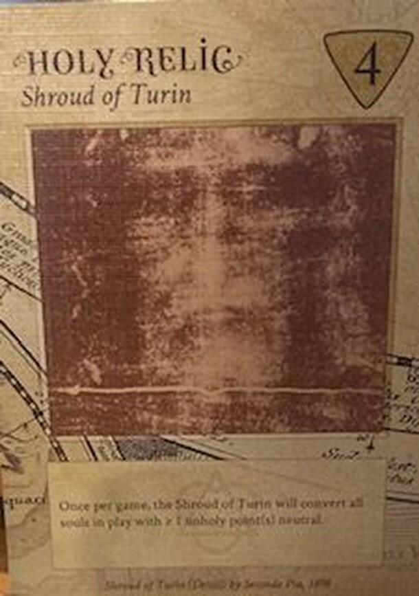 A Kickstarter-exclusive promo card for the 1st edition only, this is a Holy Relic card that can only be played once per game. Converts all souls in play with ≥ 1 unholy point(s)...