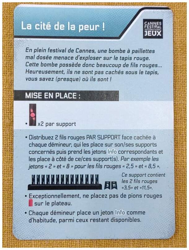 Promo card given at the 2024 Cannes Board games Convention (FIJ) a mission titled "La cité de la peur" in french, "The City of Fear" in English (reference to a French second-class horror movie has to be shown at Cannes Film Festival called "La cité de la peur".