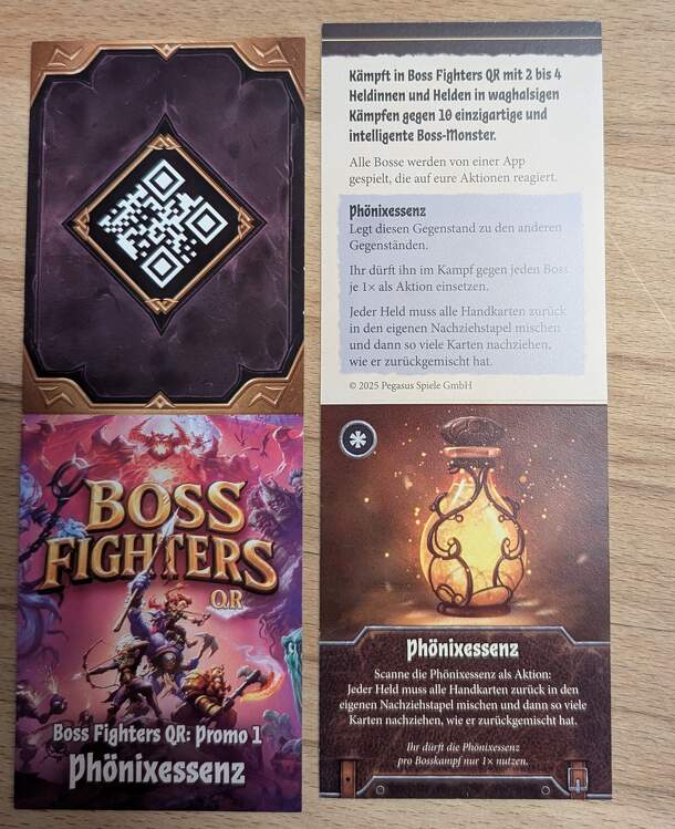 A Boss Fighters QR: Phönixessenz Promo egy nagyszerű kiegészítő a Boss Fighters QR társasjátékhoz, 2 - 4 játékos részére. A társast, 10 éves kortól ajánljuk kipróbálni. Kooperatív jellegű.