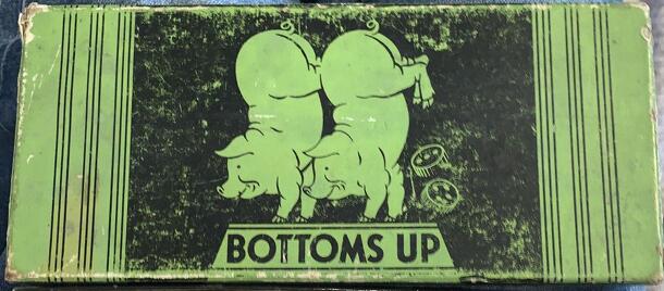 This dice game by The Embossing Company is a variant of Shut the Box which does away with the box and uses a set of 9 chequers with one to nine spots on their faces and a depiction of a pig's bottom on the back. Each player rolls two dice during their turn and flips over one, two or three (Shut the Box only allows one or two numbers to be flipped) chequers which add up to the total rolled on the dice. The player keeps going until he/she is unable to flip over chequers, when play passes to the next player. Each player is supposed to have their own set of chequers and before taking a turn, a player has to ante a chip into the centre of the table. When the turn comes round again, a player continues to try to flip over any remaining chequers that still show spots. The first player to go "Bottoms Up" (i.e. flip over all their chequers) gets all the chips from the centre as well as a chip for each spot still showing on other player's checquers.