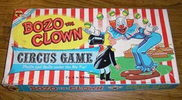 Spin and move children's game. Based on the TV show Bozo the Clown. The board shows Bozo in the Circus,under the big top.