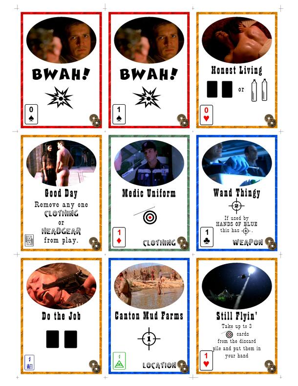 An expasion for BWAH! The game BWAH! is based on the game BANG! re-themed for the "Firefly" universe created by Joss Whedon. Not a standalone game, "Only a hoe-tze duh pee goo would try to play with only these cards." This expansion includes 9 more characters and 9 more cards. The characters cards feature some minor characters in the TV series including a Reaver character. In addition, two new symbols affecting game play are introduced.
