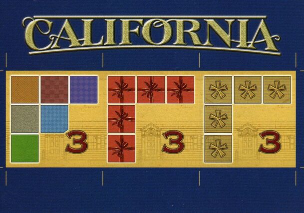 This is an expansion to California that is found on the back of Abacus Spiele's catalogs. Three new scoring cards are added to the game. They are: The first player to fulfill the conditions matching a bonus card already claimed by another player, takes this new wild bonus card instead. (1 point) The first player who obtains a gift takes this bonus card. (2...