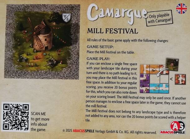 One tile mini-expansion given away at Spiel 2025. Setup: Place the Mill Festival on the table. Gameplay: If you can enclose a single free space with your landscape tile during your turn and there is no path leading to it, you may place the Mill Festival in this free space. In addition to your regular scoring, you receive 20 bonus points for this, which you...