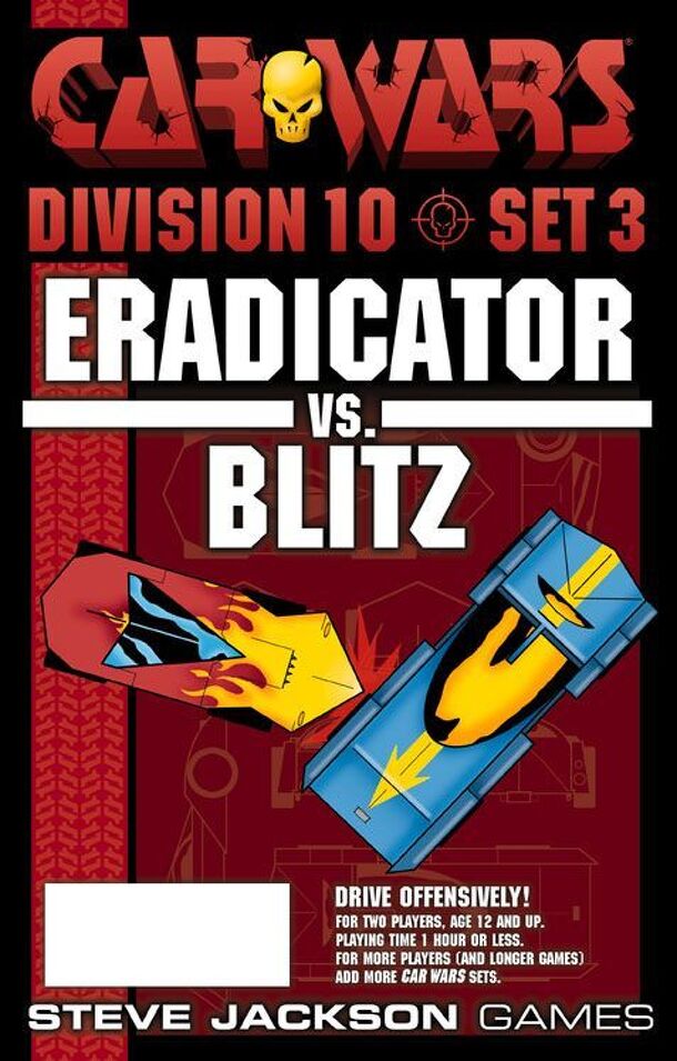 Car Wars Fifth Edition Starter Set, Division 10 - Set 3 is a complete starter set for Car Wars: the basic rules, counters and components, and two cars. The cars are Eradicator vs. Blitz (with each have modifications). Division 10 duels allow a total of $10,000 for a vehicle. The Car Wars Turning Key included in the set is especially helpful. Part of the...