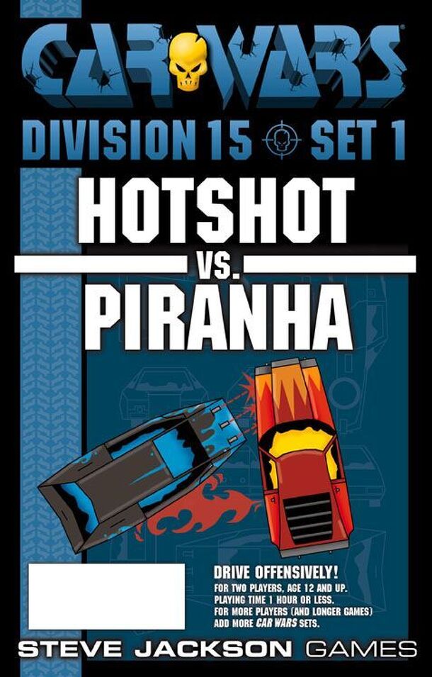 Car Wars Fifth Edition Starter Set, Division 15 - Set 1 is a complete starter set for Car Wars: the basic rules, counters and components, and two cars. The cars are Hotshot vs. Piranha (with each have modifications). Division 15 duels allow a total of $15,000 for a vehicle. The Car Wars Turning Key included in the set is especially helpful. Part of the Car...