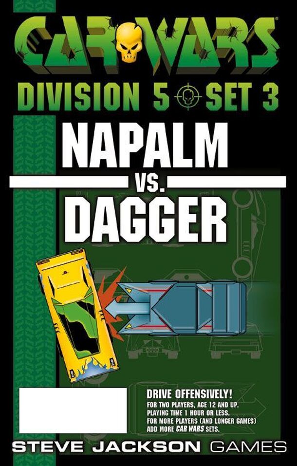 Car Wars Fifth Edition Starter Set, Division 5 - Set 3 is a complete starter set for Car Wars: the basic rules, counters and components, and two cars. The cars are Napalm vs. Dagger (with each have modifications). Division 5 duels allow a total of $5,000 for a vehicle. The Car Wars Turning Key included in the set is especially helpful. Part of the Car Wars...