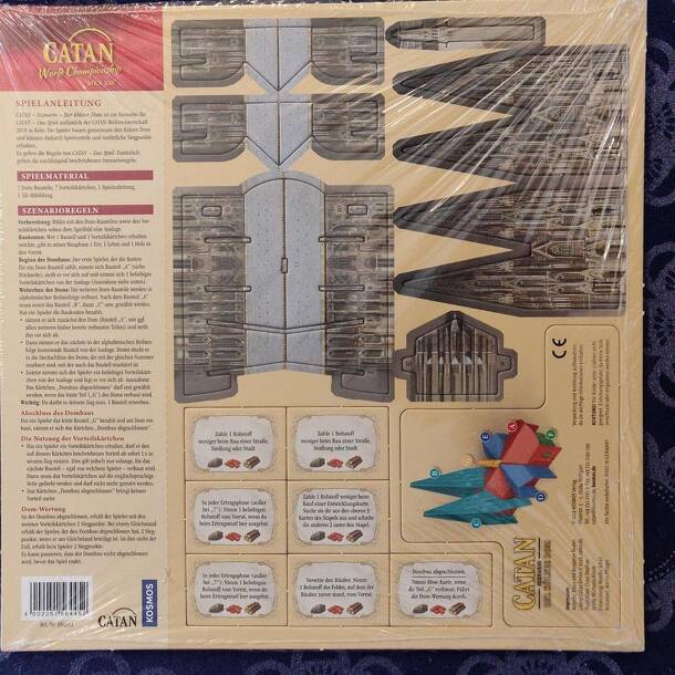 It comes with 7 cathedral parts, 7 advantage tiles, 1 game instruction and 1 3D illustration. The players have to build the cathedral. One part of the cathedral costs 1 ore, 1 brick and 1 lumber. If you pay the cost you get the next part of the cathedral and an advantage tile. After cathedral construction is completed, the player with the most advantage tiles receives 2 victory points.