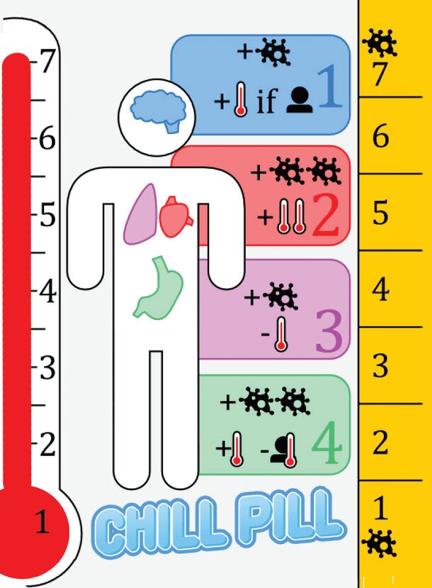 Way back at the end of 2015, we released a little wallet game called Fever Chill. It's nearly sold out at this point, but revived by Nat Levan in his line of Nanodaptions that capture the essence of the game in a smaller package. In Chill Pill, you will simultaneously choose actions to try to raise the infection level above 7 without raising the temperature too high.