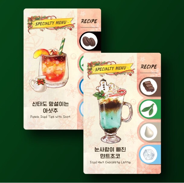 Two promo cards for 2024 Christmas. Peach iced tea with shot, iced mint chocolate latte.