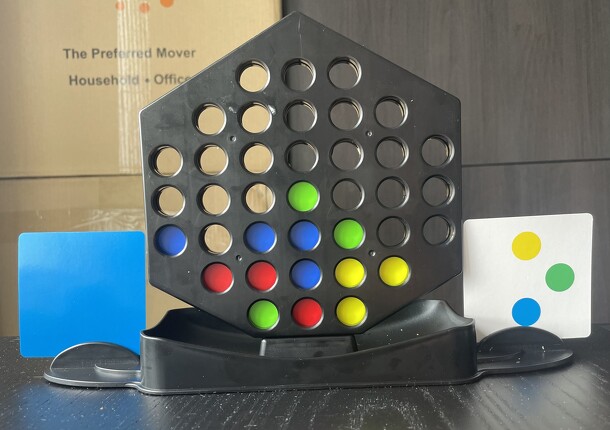 Draw a card, then take turns to select a coloured token and place it in a octagon-shaped grid. When tokens in the grid match the pattern on your card, declare the card as...