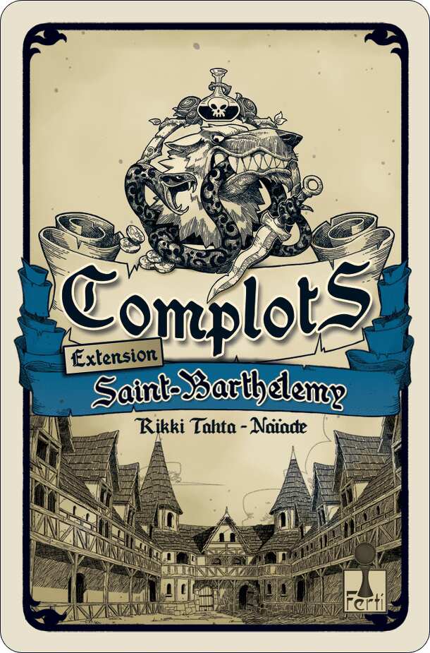 In Complots: Saint Barthélemy, each player is assigned a team (prostestant or catholic) and they are forced to work together until one team is eliminated. Additional rules add the ability to convert a player to the opposite team at a cost. The extension includes 8 dual-sided cards to mark each player’s team, a new Hospice card and a set of rules.