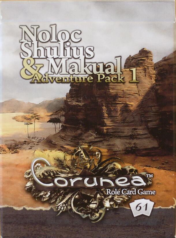 A Corunea RCG Adventure pack #1: Noloc Shulius & Makual egy közepesen összetett kiegészítő a Corunea társasjátékhoz, 2 - 4 játékos részére, az átlagos játékidő rövidebb, csak 1 óra. A társast, a bonyolultsága miatt, csak 12 éves kortól ajánljuk kipróbálni. A játékmenet erősen épít a szerepjátszás és a kockadobás mechanizmusokra.