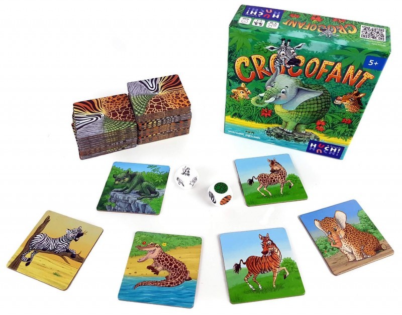 Bár emlékeznék, hol volt tigriscsíkos állat… Az sem baj, ha épp elefánt vagy krokodil hordja azt a bundát! A Crocofant egy szokatlan párkeresős játék. Hat állat bújik hatféle bőrbe (vagy bundába), és az egyik dobókocka mondja meg, hogy épp mit kell keresni. Ha az állatfajkockával dobunk, mindegy, hogy a kidobott állat kártyapárja milyen mintájú. Ha a bőrkockával dobunk, mindegy, hogy zebra vagy krokodil viseli a zsiráfgúnyát.