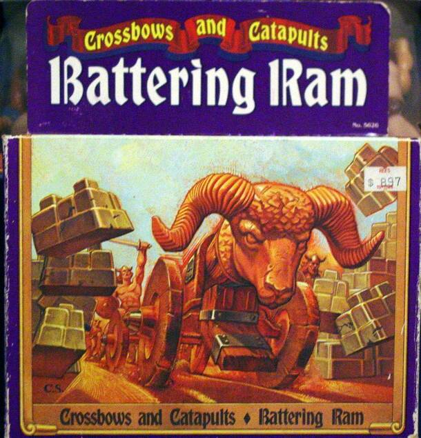 Battering Ram expansion adds a battering ram to Crossbows and Catapults. The Battering Ram is a unique addition to C&C as it does not use a carom to inflict its damage. Instead, the battering ram is a wheel based, spring-loaded bastion of brick destruction. A well lubricated ram will travel about 3 feet on a smooth surface, and it's spring-loaded ram head can destroy most 2 brick thick walls at point of impact.