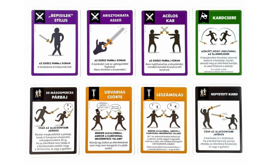 A választott kártyakupac a párbaj szabályait is meghatározza: mikor kell a vívóknak meghajolniuk, hogyan fogják meg a kardot, érintkezzenek-e a térdek közben (vagyis „bepisilek” stílusban kell megküzdjenek), zsonglőrködjenek, számoljanak-e le… azaz be csörte közben. És a kisebb játékosoknak sem kell a vereségtől tartaniuk: nekik esélykiegyenlítő szabályok segíthetnek!