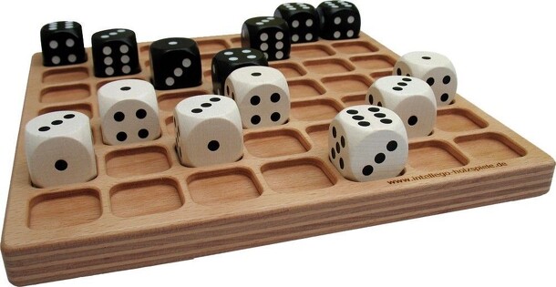 A different dice game. No lucky dice here, as they are used as tokens in this game. The special thing about the game is, that in order to move the dice forward, they are tilted over their edges. There are two game variants: In the first variant, a player’s dice must reach the opposite end of the board first. If two dice of the opposing players are colliding, the dice showing the lower number has to be removed from the board. The second game variant resembles Halma but is more demanding. Players can hop their dice over any other dice in a straight line attempting to get as many of their own dice as possible to the opposite baseline of the board. The game ends if one player manages to completely occupy the other player’s baseline. However, the player who first manages to do so, needn’t be the winner of the game! The winner is determined by adding up each player’s eye number of dice already on the opposite baseline. Though players will need to make some minor tactical considerations during play, CUBLINO is definitely a great fun to play game. It is a family game for adults and children of 5 years and older. CUBLINO’s elaborate design features slots for the dice and optimized edges for a smooth gaming experience