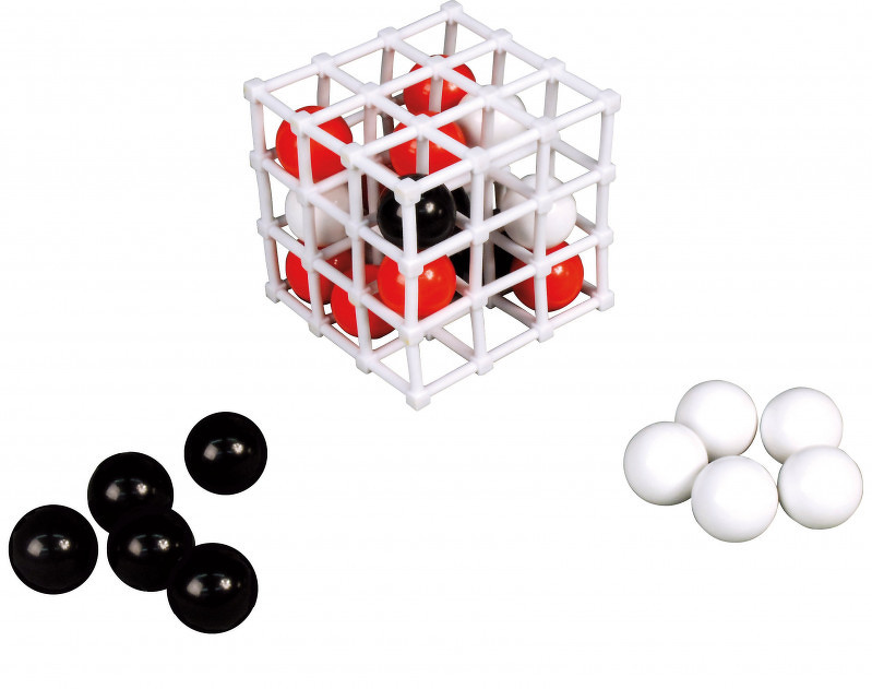 On a turn, you add a colored ball to the 3x3x3 playing area by pushing it into place – possibly pushing other balls out of the way – or change the order of balls in a completed row by pushing them one space, then reinserting the ball pushed out of the row. With two players, one color of balls is neutral. Keep your eyes on all sides of the cube to prevent others from squaring off for the win.