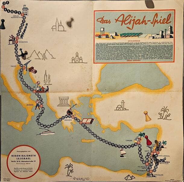 In Zionist discourse, "Alijah" is a term for migration to Palestine. Das Alijah-Spiel ("The Alijah Game") is a roll-and-move game depicting that migration. Players travel from Germany to Emek Chefer. Several events may occur during their journey, which are triggered when a player lands on a specific space. Each event has some story attached to it; mechanically, this results in having to go a few spaces back or forward, or having to skip one or more turns.