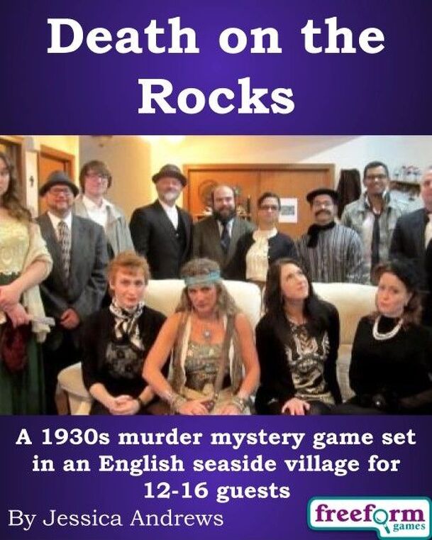 Death on the Rocks is a 1930s murder mystery game for 12-16 guests and one host. A peaceful (if rather peculiar) English village community has been disrupted by a savage murder.