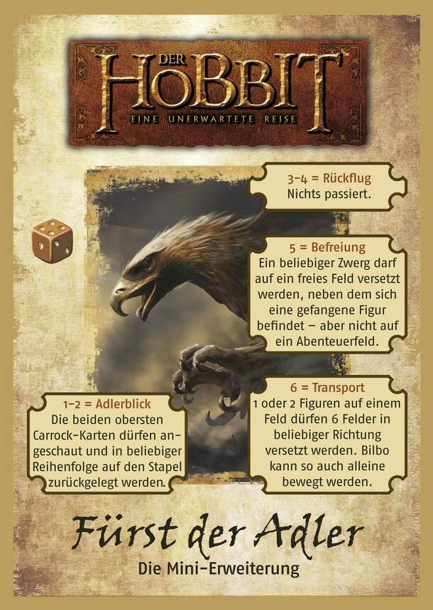 A Der Hobbit: Eine unerwartete Reise: Fürst der Adler – Die Mini-Erweiterung egy könnyen tanulható kiegészítő a Der Hobbit: Eine unerwartete Reise – Das Spiel zum Film társasjátékhoz, 2 - 4 játékos részére, az átlagos játékidő rövidebb, csak 1 óra. A társast, a könnyebb tanulhatósága ellenére, csak 10 éves kortól ajánljuk kipróbálni. Kooperatív jellegű, a...