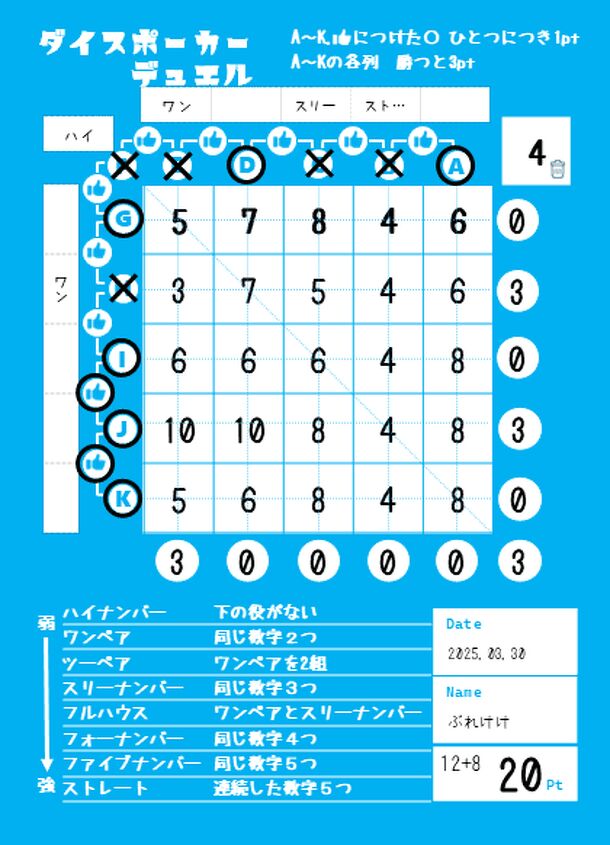 This is a 2 player paper pen game. There are 5x5 squares on the sheet hidden by each other's tapes. Players fill in the die rolls on their sheets and place them in each row at the end of the game for a poker game.