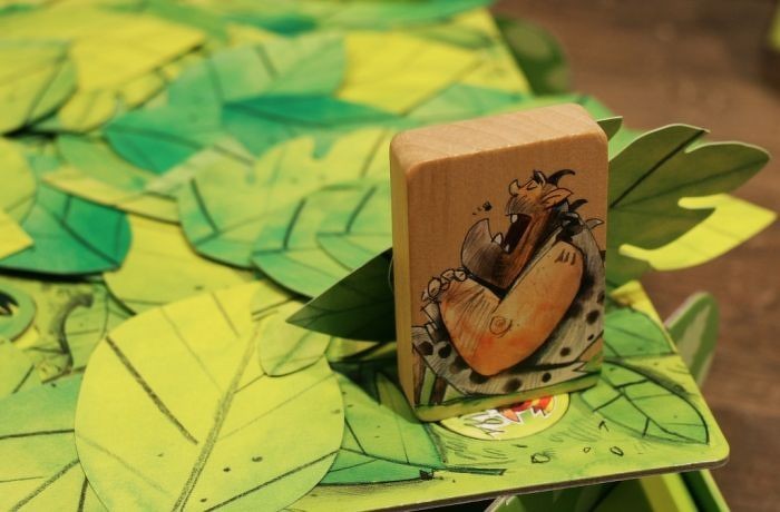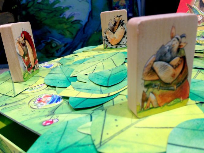 To set up, players place the 16 imp tokens in the holes on the game board, cover these imps with the 85 cardboard leaves included in the game, then place one large wooden giant on each corner of the board. On a turn, the active player reveals a search card showing one of the imps. An opponent flips the sand timer, then the player uses her magic wand to push the leaves aside and (fingers crossed!) find the imp on the search card. She can use her wand to move the giants as well, but if they fall off the game board – or even so much as a single leaf falls – the giants awaken and chase the player away empty-handed. If the player reveals the target imp, though, she keeps the search card to record her find. After each search, players cover the board again and return the giants to their places. In the end, whoever has collected the most search cards wins!