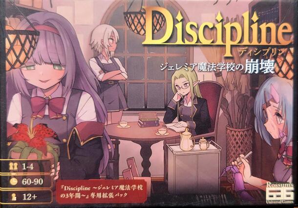 A Discipline 〜ジェレミア魔法学校の崩壊〜 egy remek kiegészítő a Discipline ~ジェレミア魔法学校の3年間~ társasjátékhoz, 1 - 4 játékos részére, az átlagos játékidő 1 - 1.5 óra. A társast, 12 éves kortól ajánljuk kipróbálni. Kooperatív jellegű, a játékmenet erősen épít a változó setup mechanizmusra.