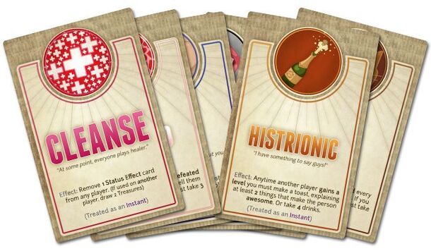 These cards bring a new mechanic to the game by adding new rules that must be followed during the game. A Status Effect might say a player has to talk like a pirate for the rest of the game. These effects force players that forget, to take a certain number of drinks!