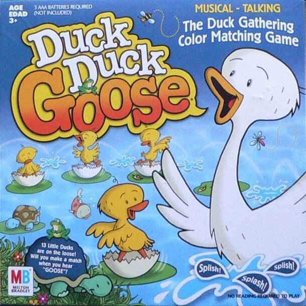 In this new addition to the Milton Bradley Nursery Rhyme series, players move an electronic mother goose around a pond shaped game board full of baby ducks. As the goose is brought down next to a duck it either calls out "Duck" or "Goose". If it calls out goose, the player checks the color on the bottom of the duck's stand and if it matches one of the 3 colors in the players nest area he keeps it. The first player to collect 3 ducks wins.