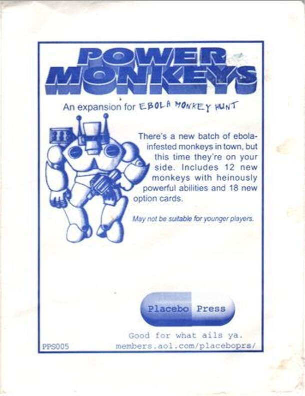 There's a new batch of ebola-infested monkeys in town, but this time they're on your side. Includes 12 new monkeys with heinously powerful abilities and 18 new option cards. May not be suitable for younger players.