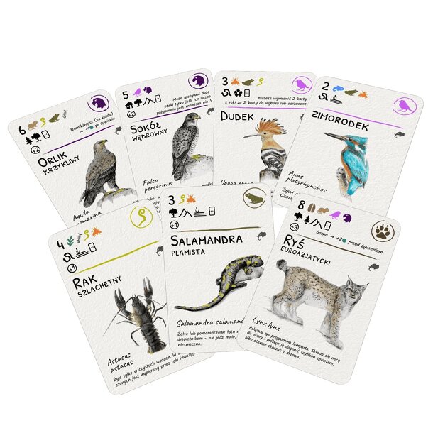 This set of seven species cards adds the Lynx, Lesser Spotted Eagle, Peregrine Falcon, Hoopoe, Kingisher, Spotted Salamander, and Crayfish to Ecologic: Europe.