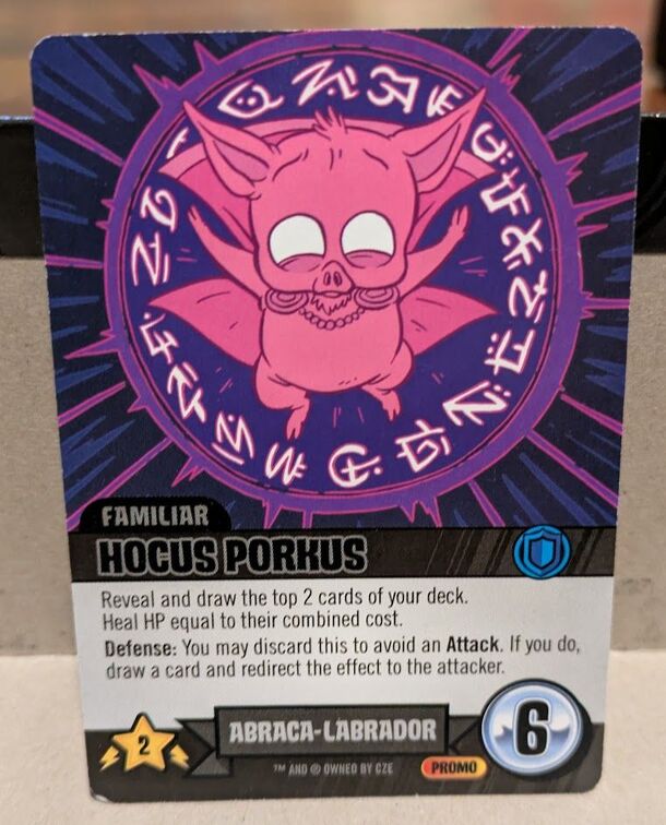 Hocus Porkus Familiar Promo for use with Epic Spell Wars of the Battle Wizards: Annihilageddon Deck-Building Game. Available as part of a prize support kit. Combines with Abraca-Labrador. Reveal and draw the top two cards of your deck. Heal HP equal to the combined cost. Defense: You may discard this to avoid an Attack. If you do, draw a card and redirect...