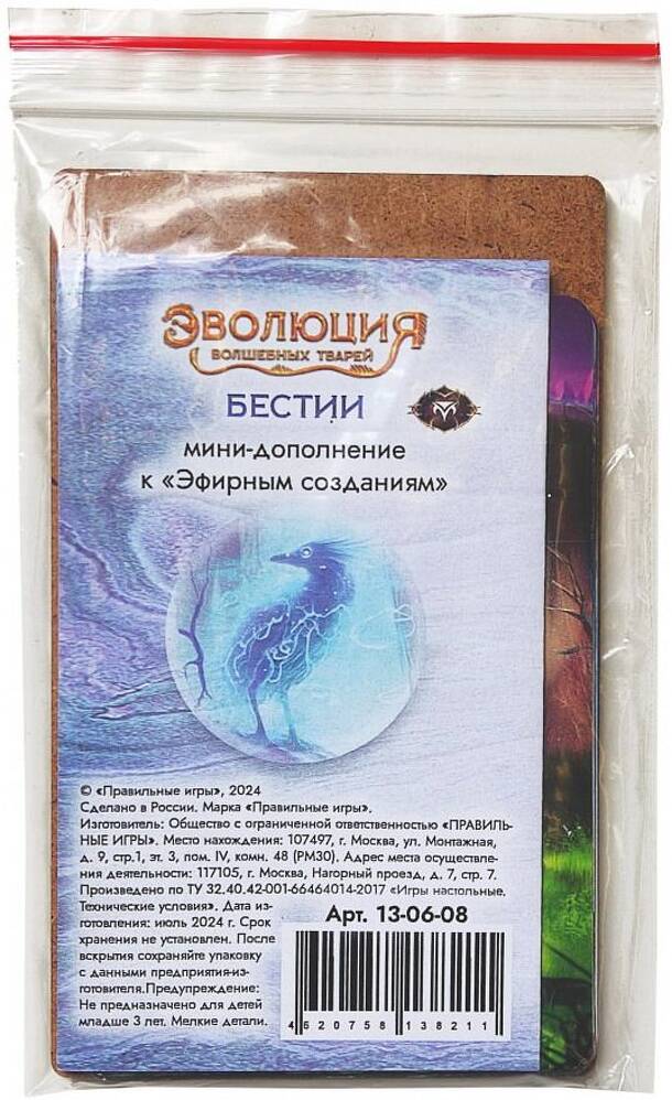 Эволюция волшебных тварей: Бестии ("Evolution: Another World – Bestias") mini-expansion adds 5 new Evolution cards that can be played only as traits. These are the Aethereal trait cards. Only creatures who have witnessed a transmutation can gain such a trait. Initially, this set of cards was a stretch goal for pre-order participants in Evolution: Another...