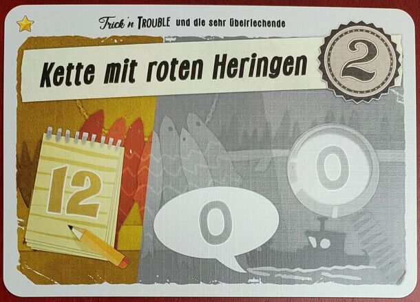 A Trick‘n Trouble: Kette mit roten Heringen promo card egy könnyen tanulható kiegészítő a Familiar's Trouble társasjátékhoz, 3 játékos részére, az átlagos játékidő rövid, csak 15 - 30 perc. A társast, a könnyebb tanulhatósága ellenére, csak 12 éves kortól ajánljuk kipróbálni. Kooperatív jellegű, a játékmenet erősen épít az ütés-váltós és a kártya húzás...