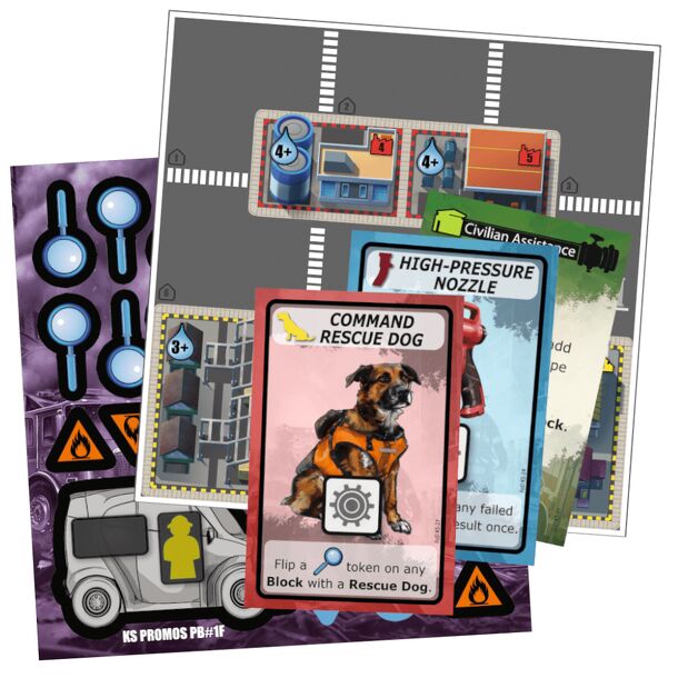 Firefighters on Duty: KS promos include all the stretch rewards generated during the KS campaign for Firefighters on Duty on 2023. Drone common vehicle Rapid responder common vehicle Floods expansion Rescue dogs expansion Public panic module Cat on a Tree module 9 additional Event cards 3 new Hazard types High pressure nozzle equipment Hoze extension...