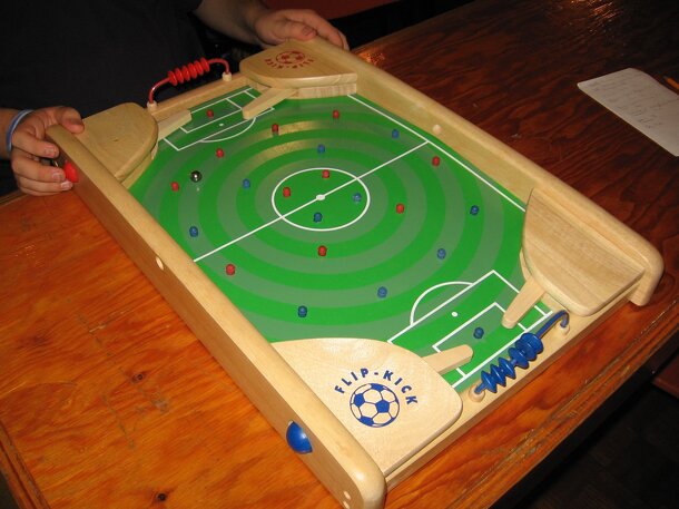 This dexterity football (soccer) game is played on a little wooden table (58 x 40 x 8 cm) where each player tries to roll the ball in the opponent's goal using good old flipper (just like in a pinball machine). The play field is curved and filled with little rubber "players" which bounce the ball around.