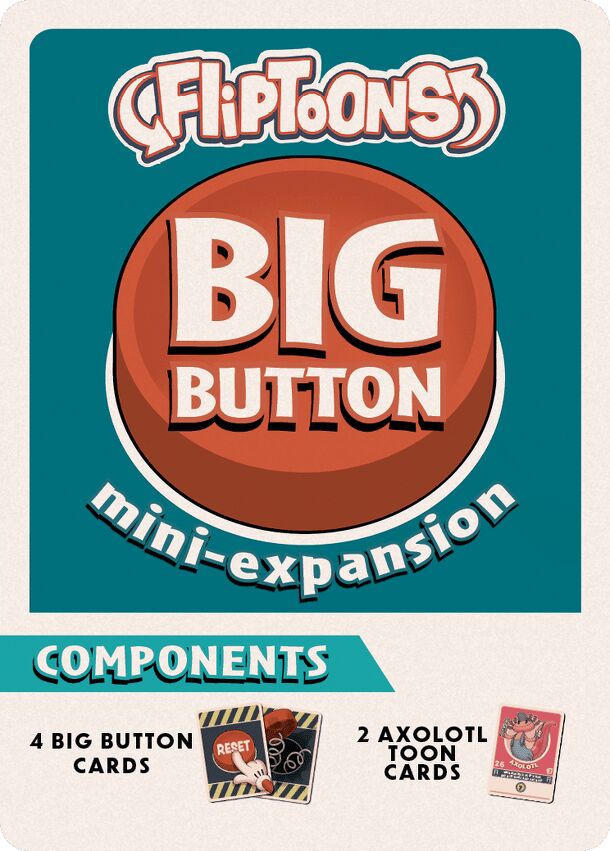 This mini-expansion card pack adds the Axolotl character and a new mechanic: the Big Red Button to FlipToons.