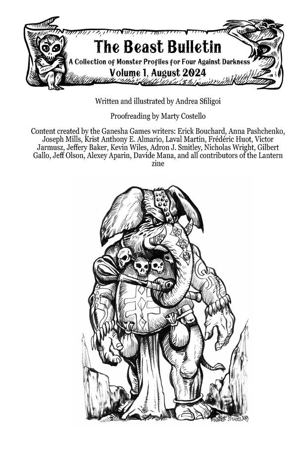 The Beast Bulletin is an ongoing collection of monster profiles for Four Against Darkness. Each monster is presented with a brief description, a black and white illustration and...