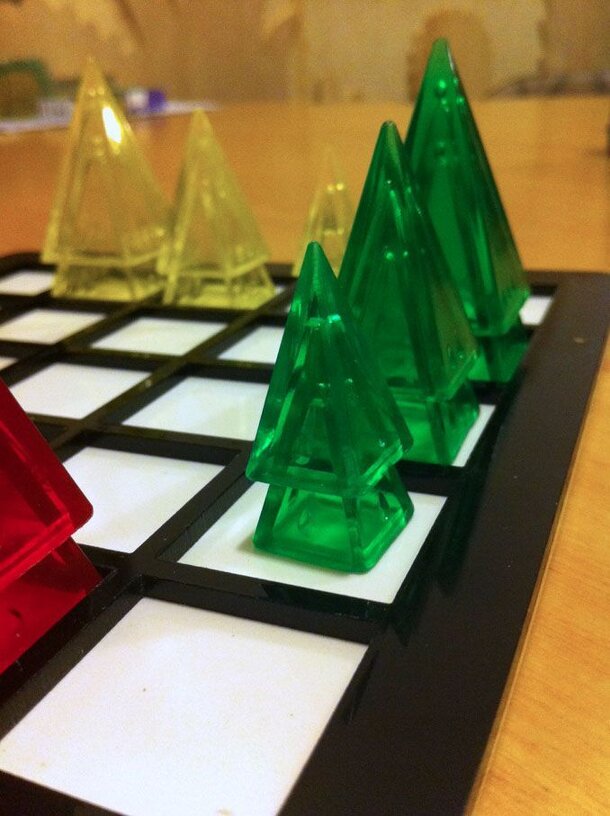 Freeze Tag is a Looney Pyramids game that uses the pyramids, a Pyramid Die, and a 5x5 board. Each turn, a player rolls the Pyramid Die and moves the piece(s) shown on the die. They can land on larger pieces to freeze them or smaller pieces to teleport them. The first person to cross the board with three pieces wins.