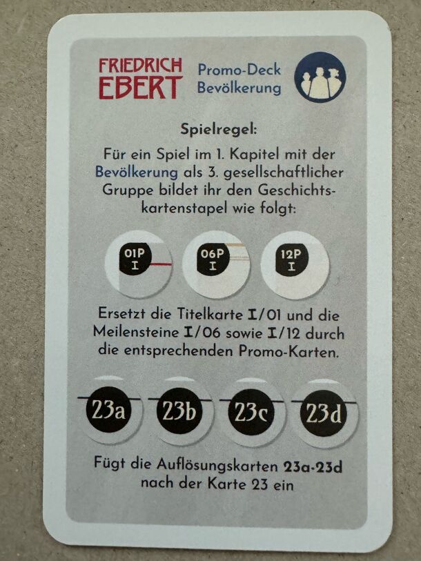 A Friedrich Ebert: Promo-Deck Bevölkerung egy könnyen tanulható kiegészítő a Friedrich Ebert társasjátékhoz, 1 - 4 játékos részére, az átlagos játékidő rövidebb, csak 45 perc. A társast, a könnyebb tanulhatósága ellenére, csak 12 éves kortól ajánljuk kipróbálni. Kooperatív jellegű.
