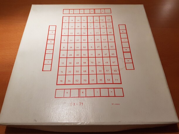 Five dice are rolled. The players then put them on a row of squares separated by +...x...:...-. With this, they try to reach a certain number, so they can place a chip on the corresponding square on a large game board. There are several variants explained in the rule book, for one player, for teams etc.