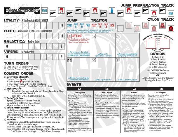 Gameplay: Each turn you roll your Jump Prep Dice (6 dice, however you only roll 5 of them until you complete the first "Humans" event) to perform your actions such as repairing your ships or advancing along the Jump Preparation Track. You will also roll the Draidis Dice (2 dice) once per turn which shows you what Cylon threats will have to be resolved in this area of space before you can continue. The Cylons are also attempting to move down their track and perform Traitorous Acts to prevent the Humans from reaching the home of the lost 13th Tribe, Kobol. As each side completes their Track, an event is triggered. If the Cylons complete 3 events before the humans do, you lose. If you complete 3 before the cylons do, you win!