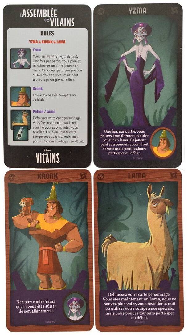 A new villain team to add to the game: Yzma: Yzma is awakened at the end of the night. Once per game, you can transform another player into a llama. This player loses their power and their right to vote, but can still participate in the debate. Kronk: Kronk has no special skills. Only vote against Yzma if you are sure of her alignment. Potion/Llama:...