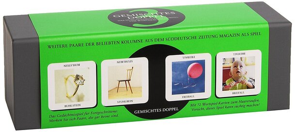 Das Gemischte Doppel 4 ('Mixed Doubles 4') is a linguistically creative memo game for adults. The newest successor of the game series comes in a red box. Here, you can find pictures and their titles matching in an entertaining way: In the fourth edition, you may have to match the cards "Strandräubermeute" and "Strandräumerbeute" or "Hindu" and "Hundi". The...