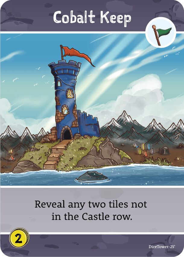 The Cobalt Keep promo card designed by Rock, Stone & Dice Games to supporters of the 2025 Support the Dice Tower crowdfunding campaign. This card was made available to those that purchased Promo Pack D. Card Details Name: Cobalt Keep Cost: 2 Gold Coins Ability: Reveal any two tiles not in the Castle Row. Note: Must be at the start of your turn, prior to...