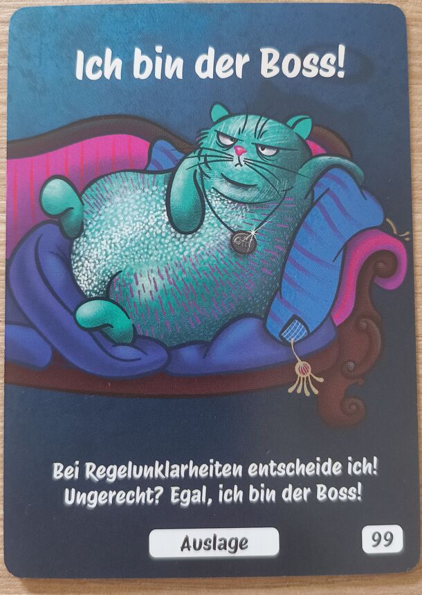 Diese Promo-Karte zeigt eine türkise Katze, die auf einer Chaise Longue liegt. Die Karte gibt dem Spieler das Recht, bei Regelunklarheiten endgültig zu entscheiden. Der Text lautet: „Bei Regelunklarheiten entscheide ich! Ungerecht? Egal, ich bin der Boss!“ Es handelt sich um eine Auslagekarte, Nummer 99, die kostenlos beim Kauf von "Fertig Ich Habe" am Pegasus-Stand auf der SPIEL 2025 vergeben wurde.