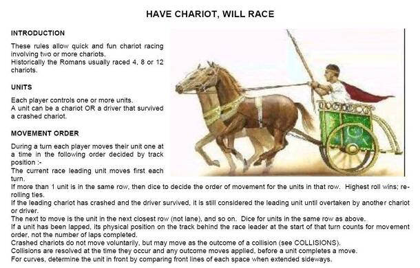 These rules allow quick and fun chariot racing involving two or more chariots. Historically the Romans usually raced 4, 8 or 12 chariots. Each player controls one or more units....