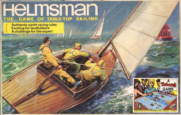 Helmsman The Game of Table Top Sailing Made in England by Minimodels LTD. The object of this game is for two or more players to complete the sailing course on the board by fair sailing and superior skill thereby beating your opponents.