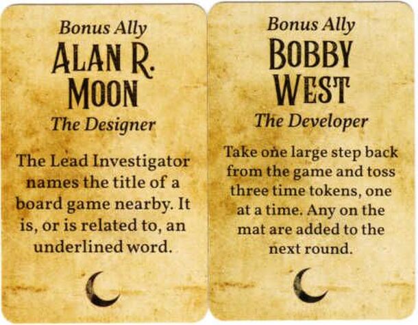 Two Bonus Ally promotional cards for Here Lies: Alan R. Moon and Bobby West.